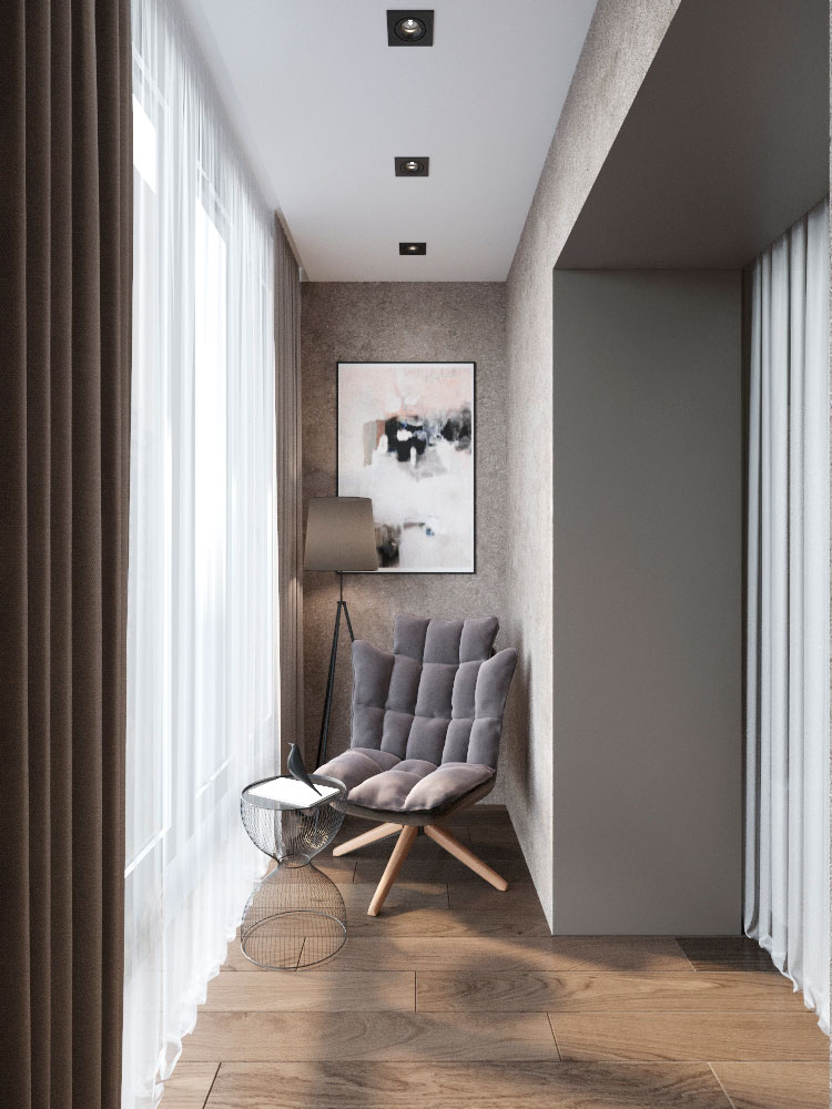 За занавеской расположена теплая лоджия с креслом и кофейным столиком. Лоджию украшает акцентная стена с декоративными рейками и зеленью.