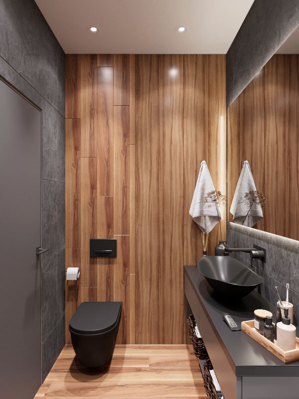Санузел элегантный и удобный. Подвесной унитаз, ванна за стеклянной перегородкой и раковина – чаша и большим зеркалом. На стенах керамогранит под серый камень и под дерево.