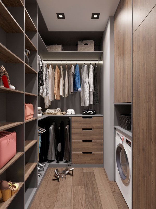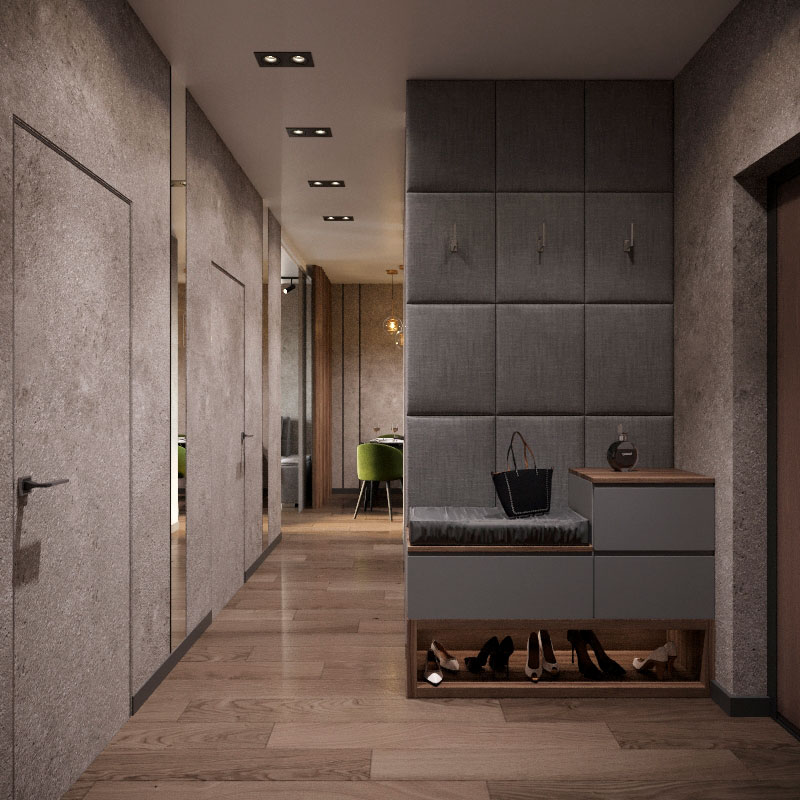 Начиная с прихожей мы погружаемся в уютную атмосферу натуральной природной гаммы. Стены решены в едином стиле и отделаны декоративной штукатуркой под текстуру камня в кофейных оттенках. Двери со скрытым монтажом подчеркивают лаконичность и не выделяются. Это позволяет при большом количестве дверей сохранить визуальное единство пространства. Изюминкой служат узкие полоски зеркал от пола до потолка, добавляющие изящество и свет. При входе расположен пуф, вешалки на стене из мягких текстильных квадратов и ящики для мелочей. Основные места для хранения скрыты рядом, в зоне гардеробной.