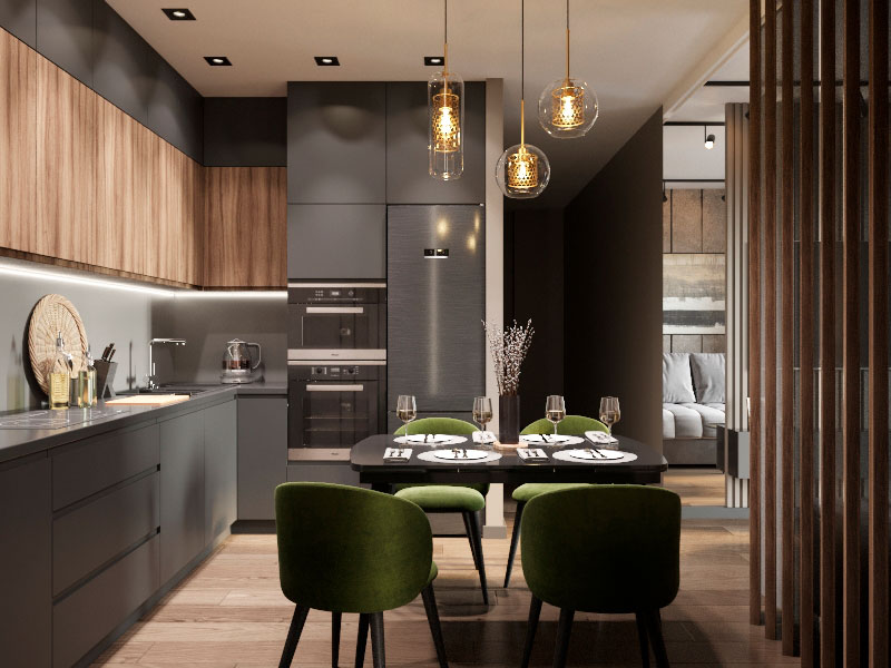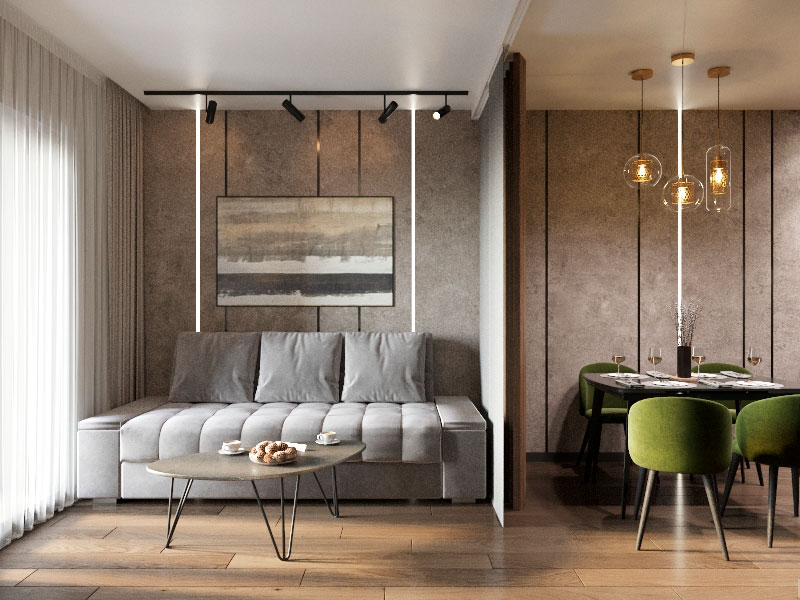 В кухне-гостиной размещен вместительный гарнитур со встроенной техникой и высокими верхними ящиками вплоть до самого потолка, куда можно на время убрать менее используемые предметы. В зоне кухни расположен прямоугольный стол с четырьмя стульями салатового оттенка, напоминающими скрученные зеленые листья. За раздвижной перегородкой в зоне отдыха находится раскладной диван, над которым есть отдельное освещение в виде трекового светильника. Благодаря линейному свету на стенах создается возможность разных сценариев освещения: более яркий свет днём и приглушенная мягкая подсветка вечером. Напротив дивана на стене размещен телевизор и подвесная консоль с ящиками. Раздвижная перегородка создает возможность отделить спальное место от остального пространства как отдельную комнату.