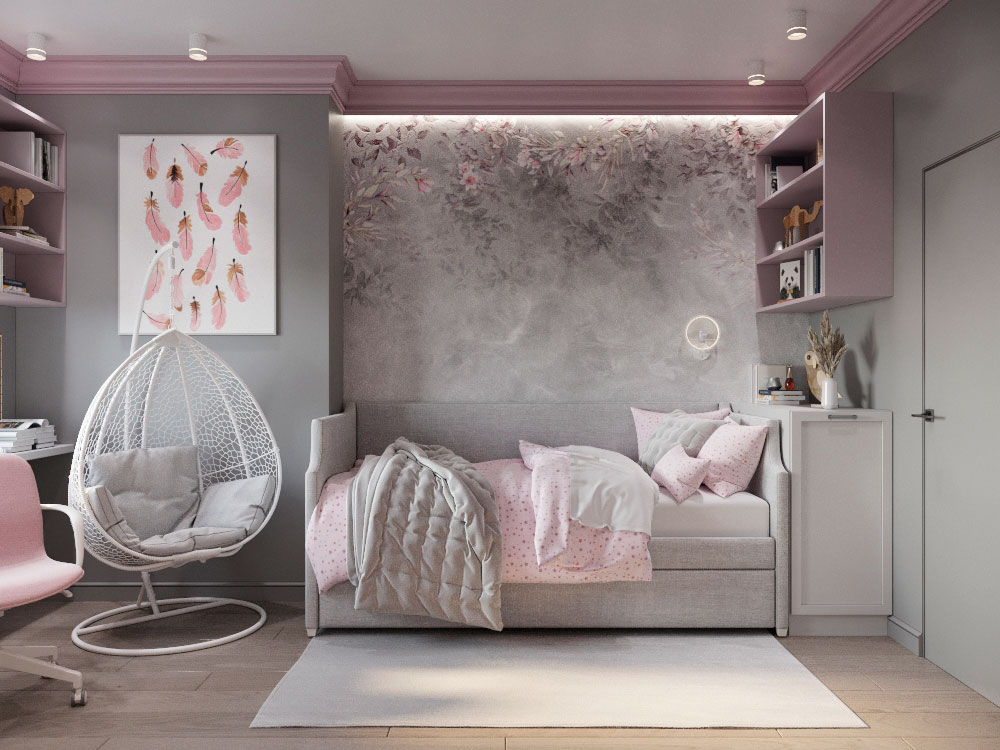 Детские комнаты отличаются по цветовой гамме от остальных помещений. Одна комната – в розовых оттенках, другая – в голубых. В розовой комнате есть спальное место, шкаф и полки для хранения вещей, а также зона ТВ, подвесное кресло для отдыха и рабочий стол. В голубой комнате пространство рассчитано на младший возраст. Здесь двухъярусная кровать, игровая зона, скалодром и турник. Шкаф для вещей встроен в плоскость стены.