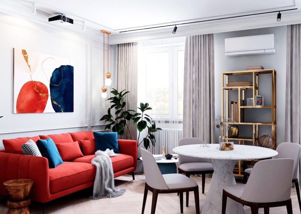 Неоклассический интерьер с яркими акцентами. Интерьер создан с использованием светлых оттенков и дополнен насыщенными и яркими цветами.