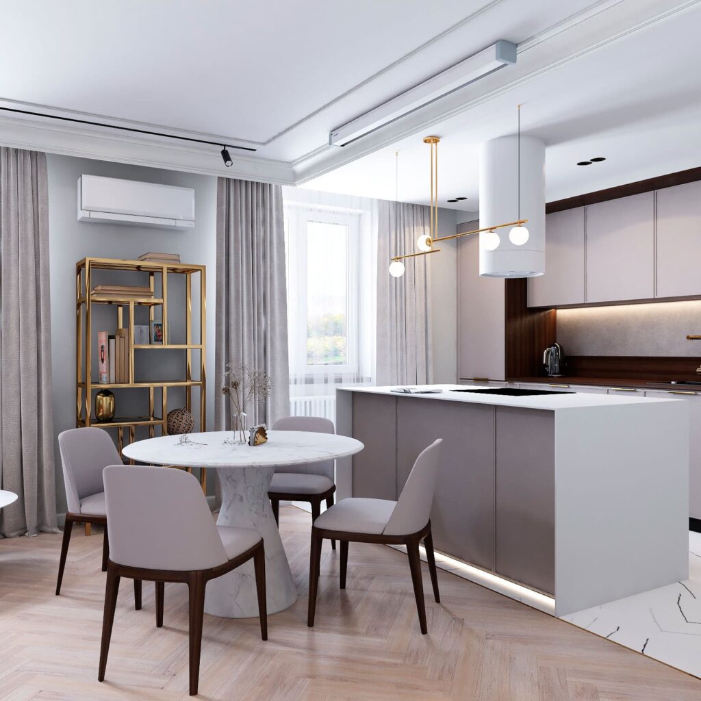 Кухня-гостиная. Пол выполнен из паркета, в кухонной зоне – плитка с текстурой белого мрамора. Элегантным дизайнерским решением является обрамление рабочей поверхности кухни темным деревом в сочетании с фурнитурой золотого оттенка.
